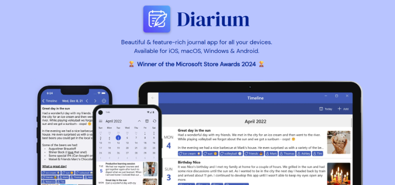 A travel blogger might use Diarium to upload voice notes and images alongside daily logs — a multimedia journal.