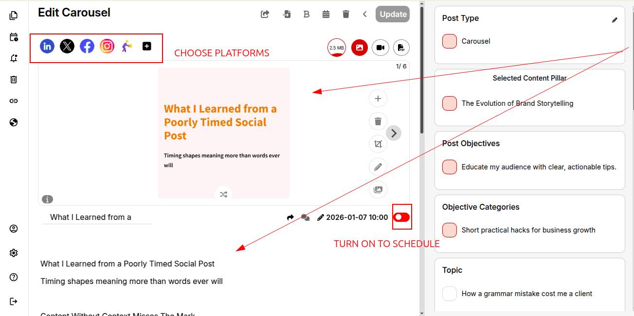 Your content and carausel are ready. Select the platforms and toggle the switch to green to schedule your post instantly.