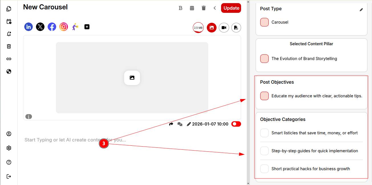 Step 3: Choose the infographic’s post objectives and objective categories so AI understands your goals.