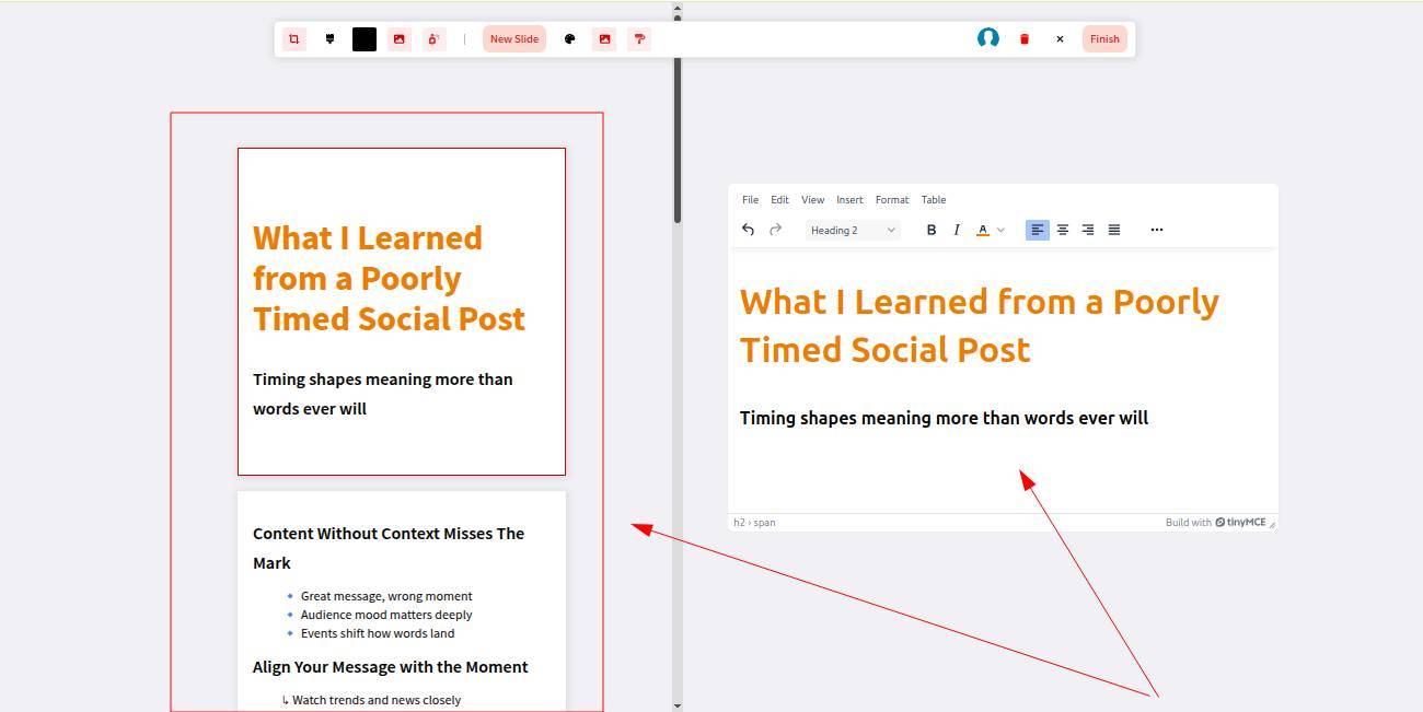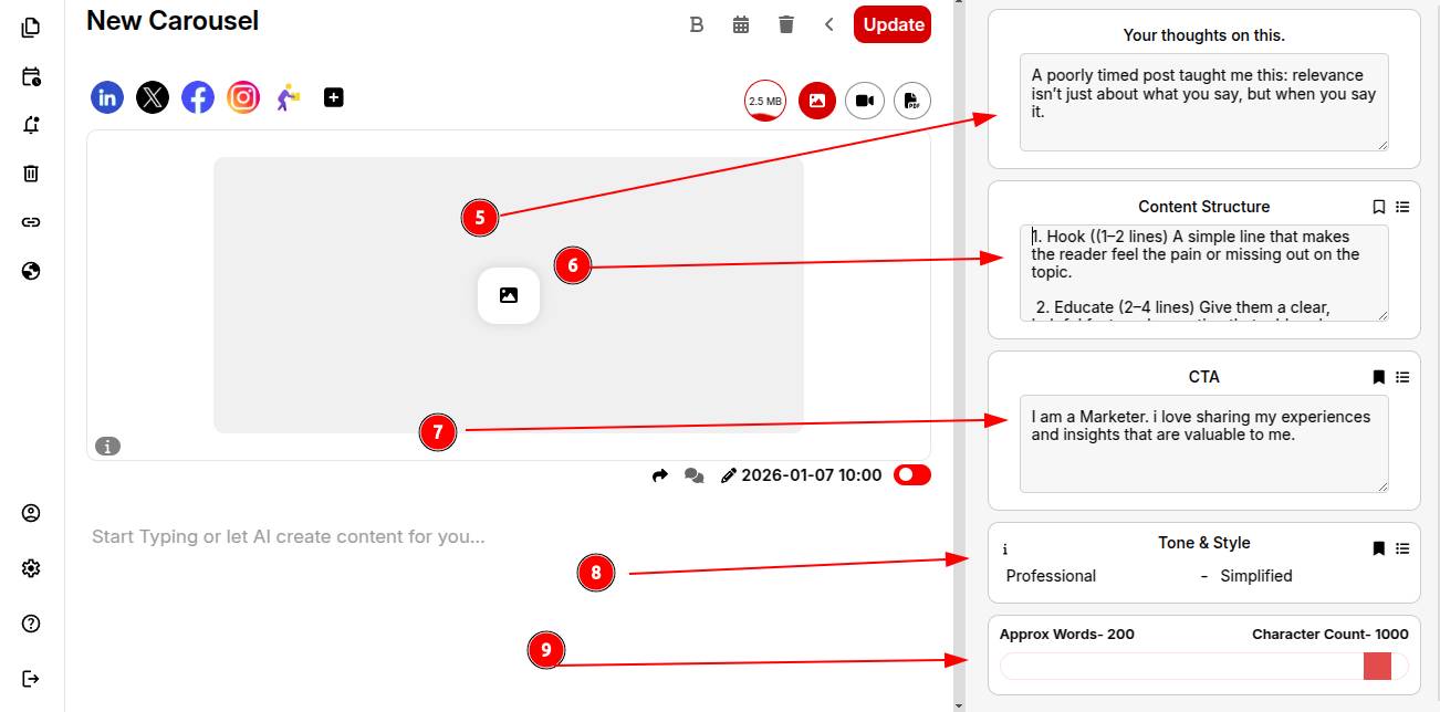 ContentCraft simplifies carousel creation by helping you choose the content pillar and suggesting AI-powered trending topics, so that you can create on-brand carousels in minutes.