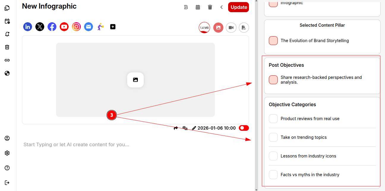 Step 3: Choose the infographic’s post objectives and objective categories so AI understands your goals.