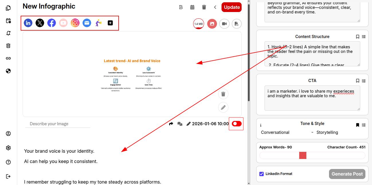 Your content and infographic are ready. Select the platforms and toggle the switch to green to schedule your post instantly.
