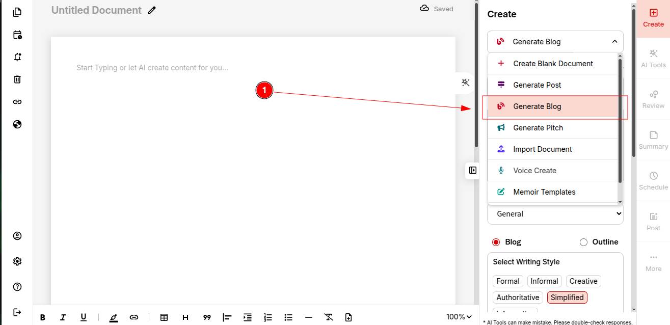 Step 1: Once you open a blank document, click on “Generate blog” from the drop-down create menu.