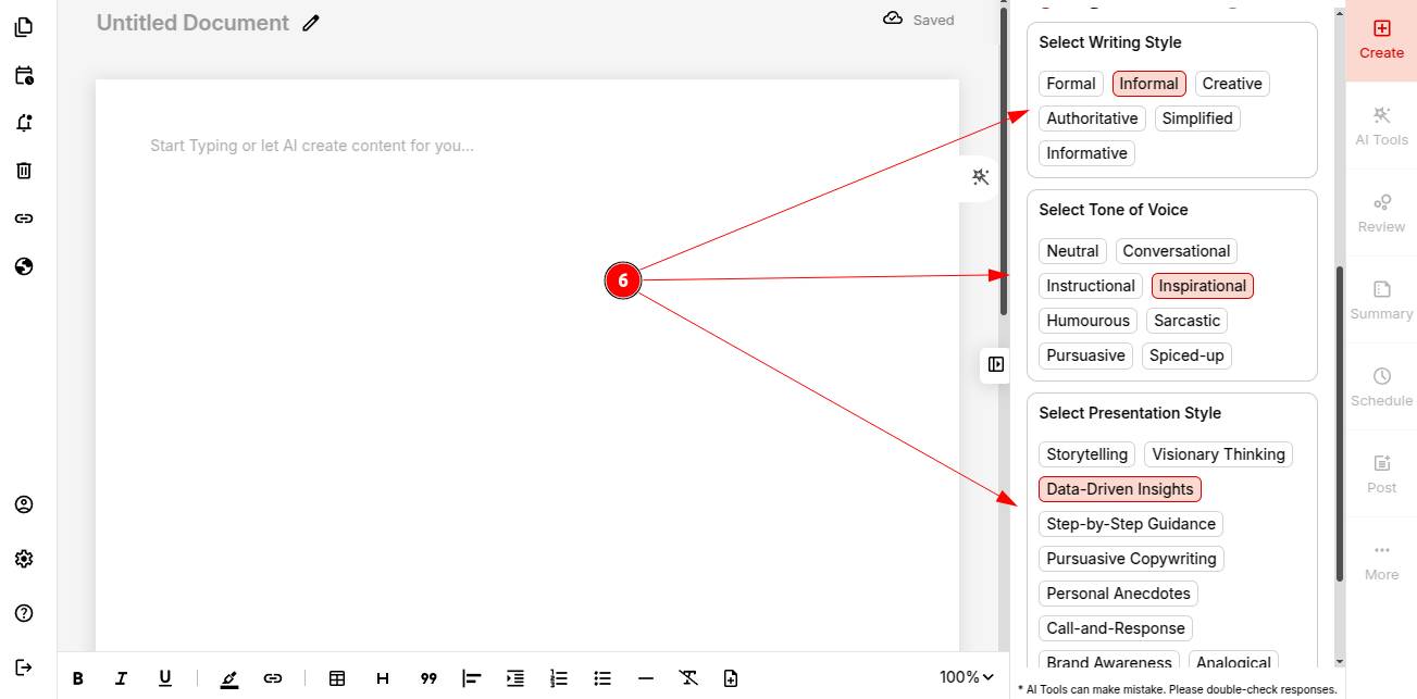 Step 6: Pick your writing style, tone of voice and presentation style to shape the final output.