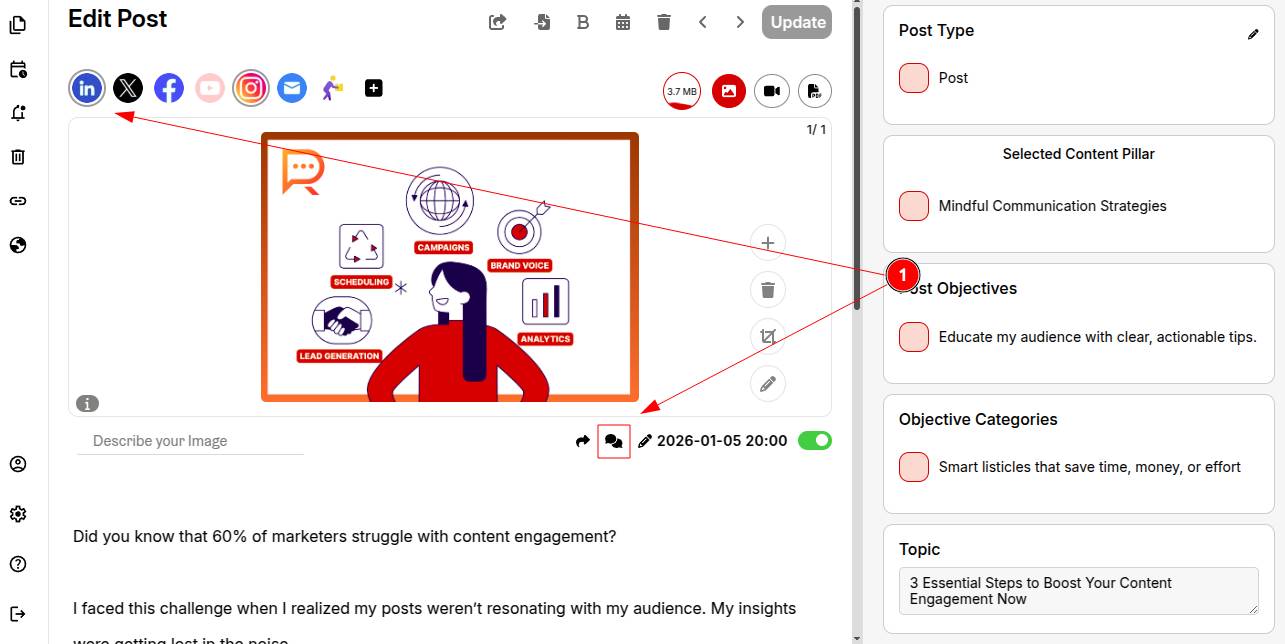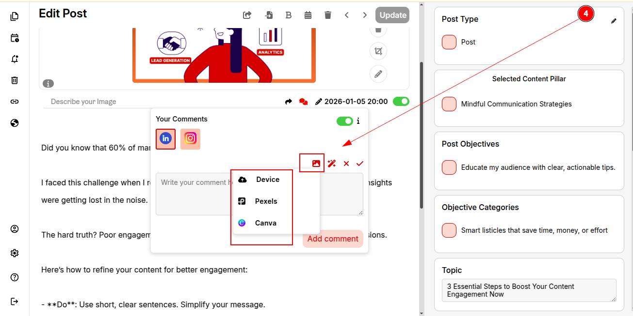 Once you open the post in the Content Calendar for which you want to generate self-comments. Follow these steps: