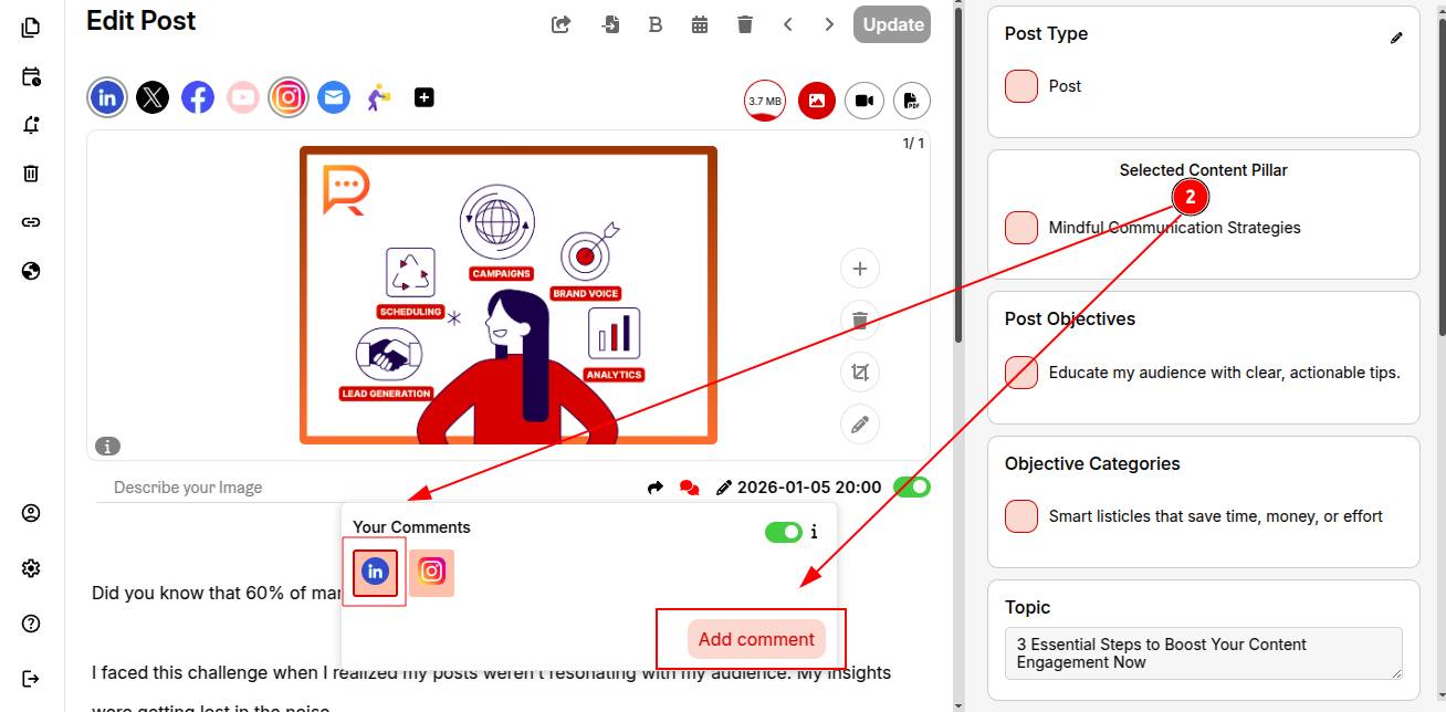 Note: Self-generated comments are currently available for LinkedIn. Support for other platforms is coming soon.
