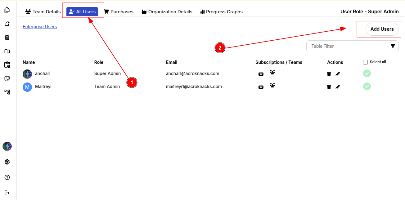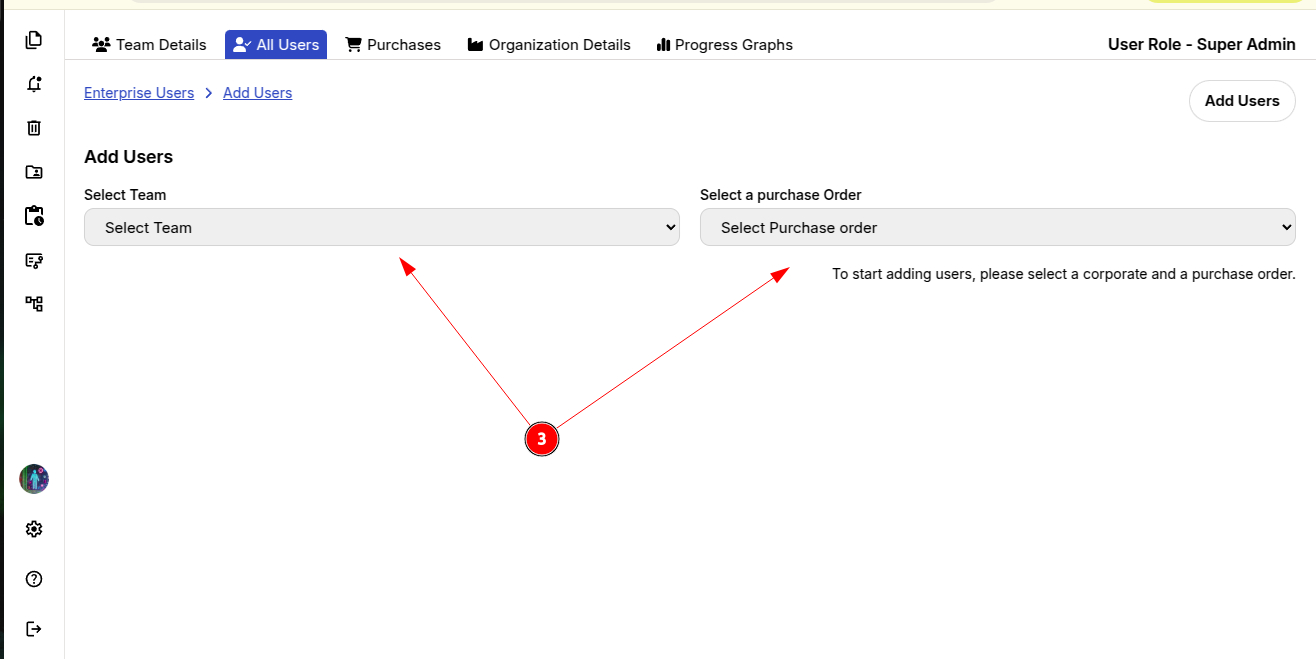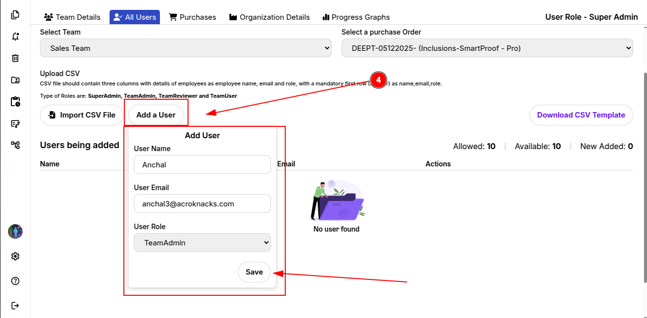 IMPORTANT : Only Super Admins and Team Admins can add users to a team. Users added to one team cannot be added to another team or another organization.