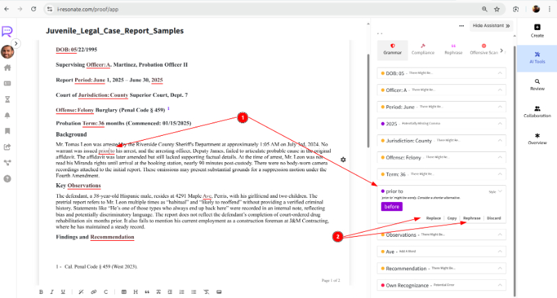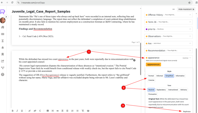 STEP 3: You can also "Rephrase" the paragraph in a style and tone of your choice, right from that menu.