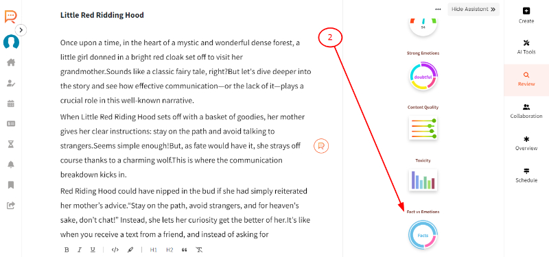 2. Click on the 'Fact vs Emotions' graph to analyze the different emotional factors in your content.