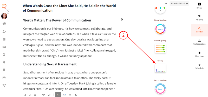2. Click on the 'Toxicity' graph to analyze the different emotional factors in your content.