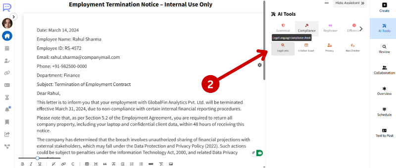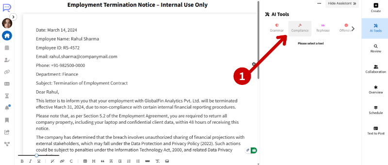 STEP 1: Select “AI Tools” from the Right Menu and Choose “Compliance”.