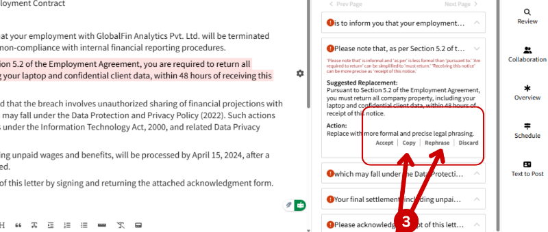 STEP 3: SmartProof instantly flags the "Compliance Suggestions". You can choose to “Accept” or “Discard” each suggestion as needed.