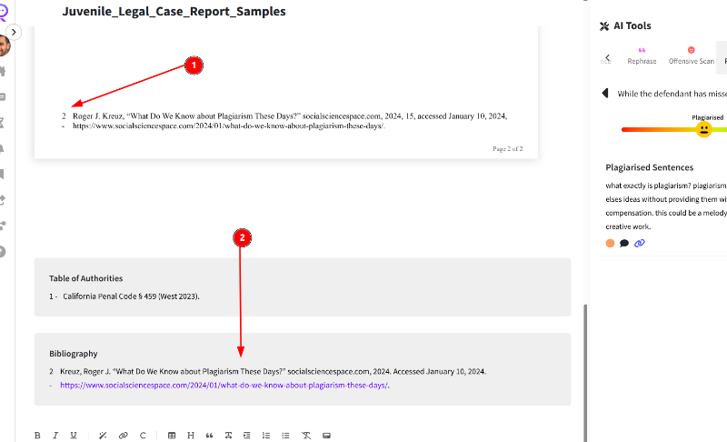 The Generated citation will appear like below in the 1. Footer and 2. Bibliography sections of the document.