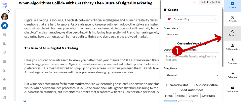 STEP:1 Click on “Review” – Open your content in SmartProof and select the Review option.