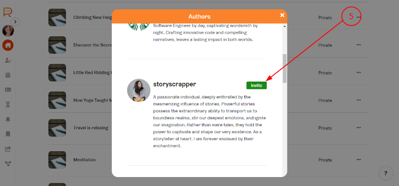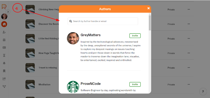4. To send an invitation to authors, click the 'invite' button. If you wish to invite a specific person, simply type their full email into the search bar.