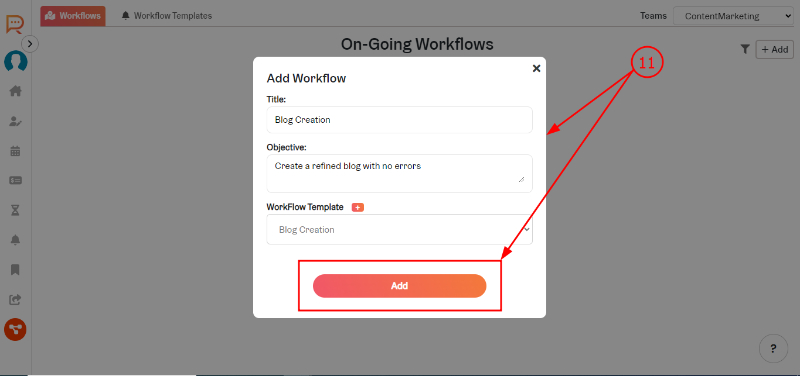 10. Add Workflow screen will appear. Give Title, Objective and select the template.Click on ADD button.
