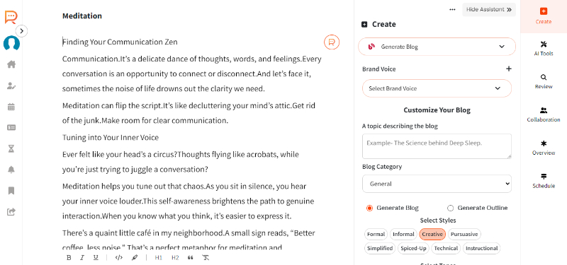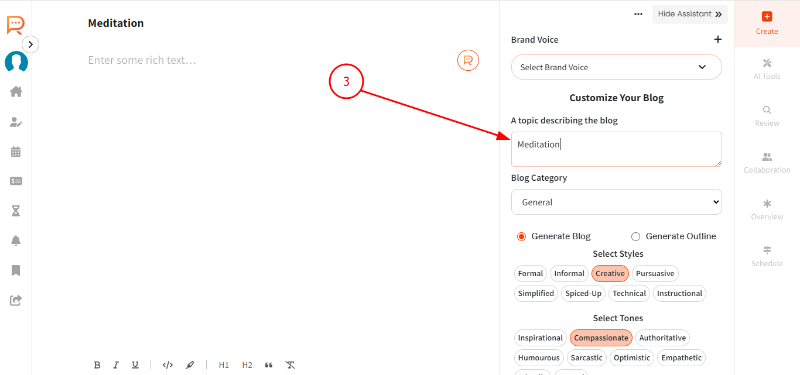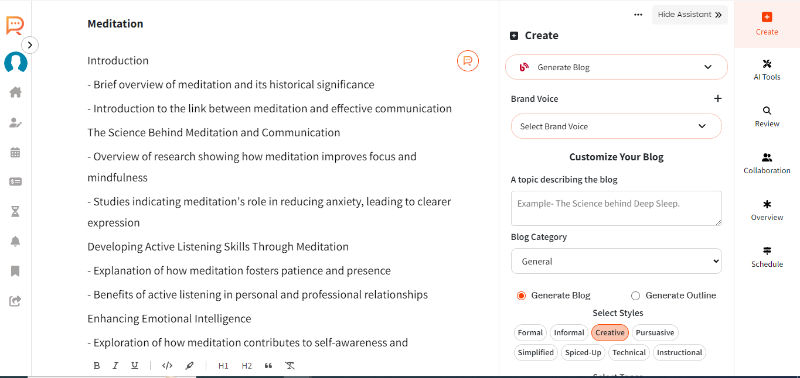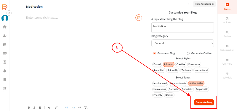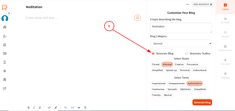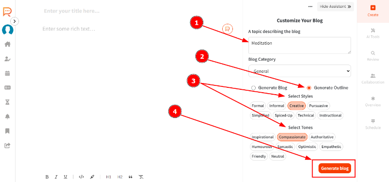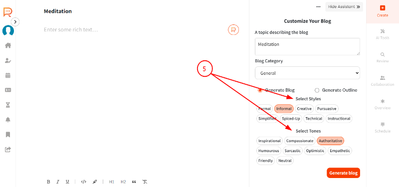 **To create outline,, select 'Generate Outline' choose styles and tones and click on 'Generate Blog' button.