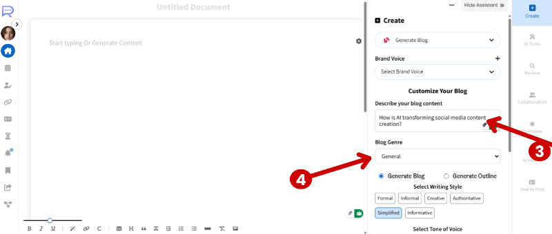 Step 5: Pick your writing style, tone of voice, and presentation style to shape the final output.