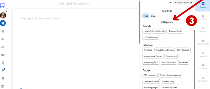 STEP-3 Select the “Category” for your post — Educate, Influence, or Engage.