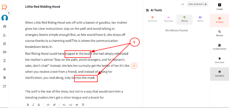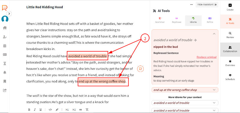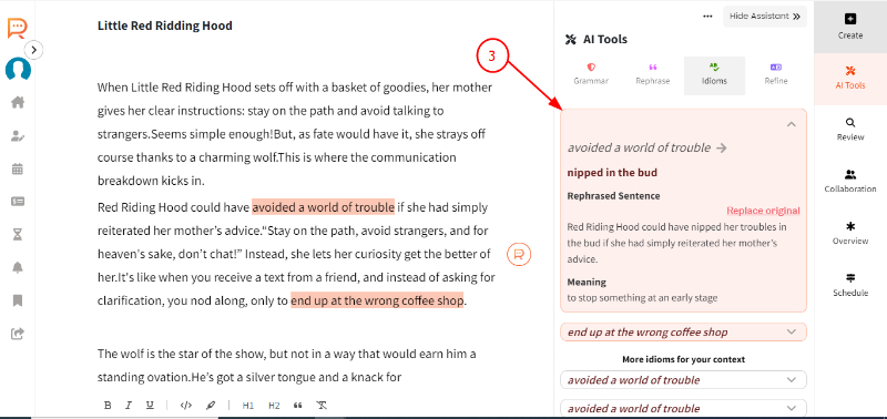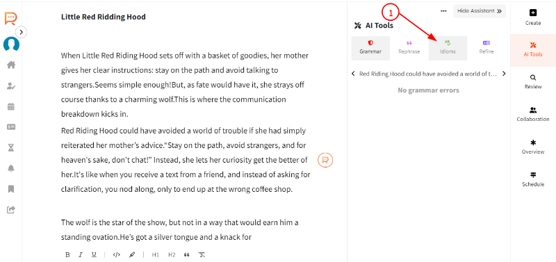 STEP 1: Open your document in the editor and then click on 'Idioms' from the AI Tools.