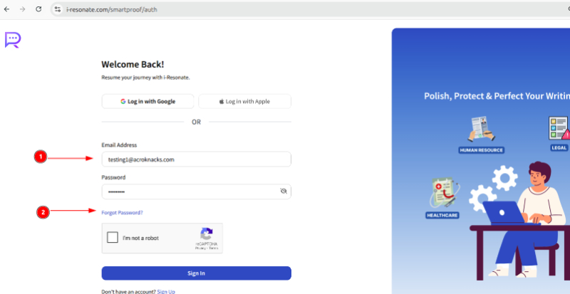 - navigate to the login page (https://i-resonate.com/smartproof/auth)