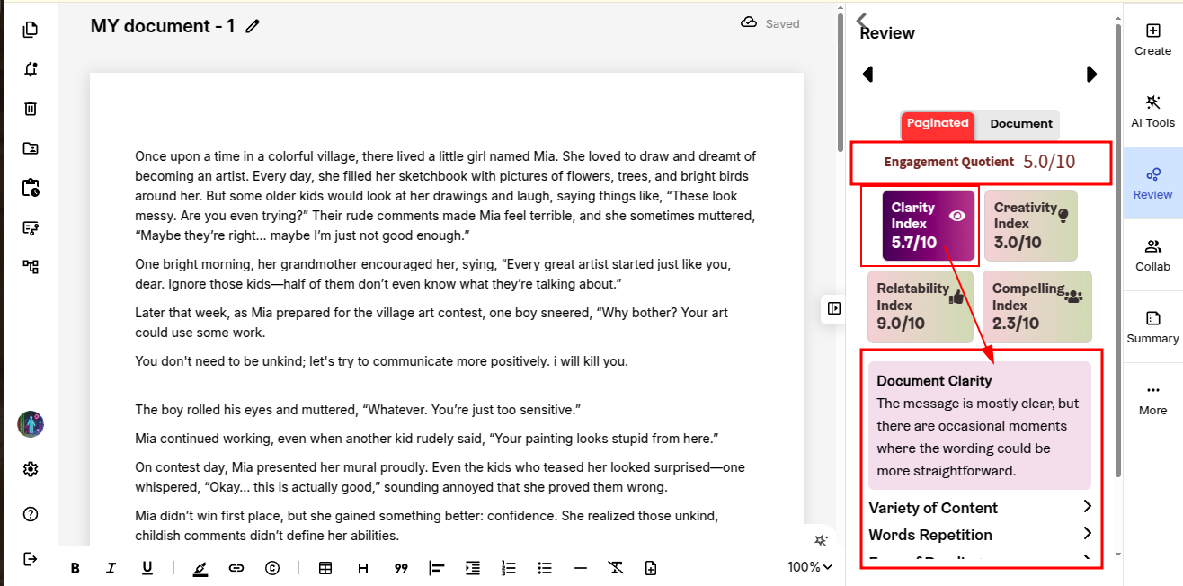 STEP 4: ProofLex will analyze your document and generate a comprehensive engagement quotient, showing how effectively your content captures and maintains reader interest.