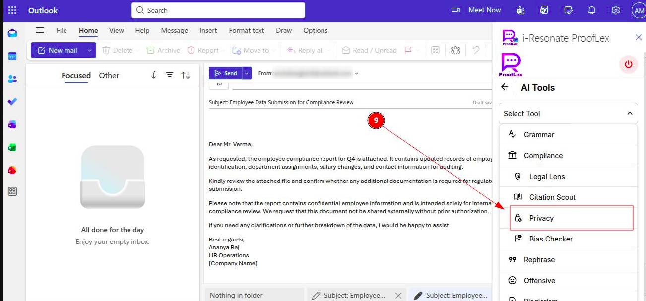 For example: Select Privacy under the Compliance AI Tools section to scan your email for any sensitive or personally identifiable information before hitting send.