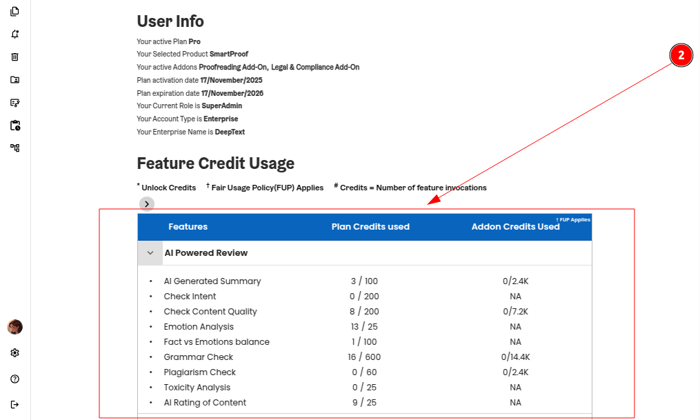 You can easily check how much of your ProofLex plan you’ve used such as AI Generated Summary, Personal Information Redaction, Legal Language Compliance directly from your dashboard.