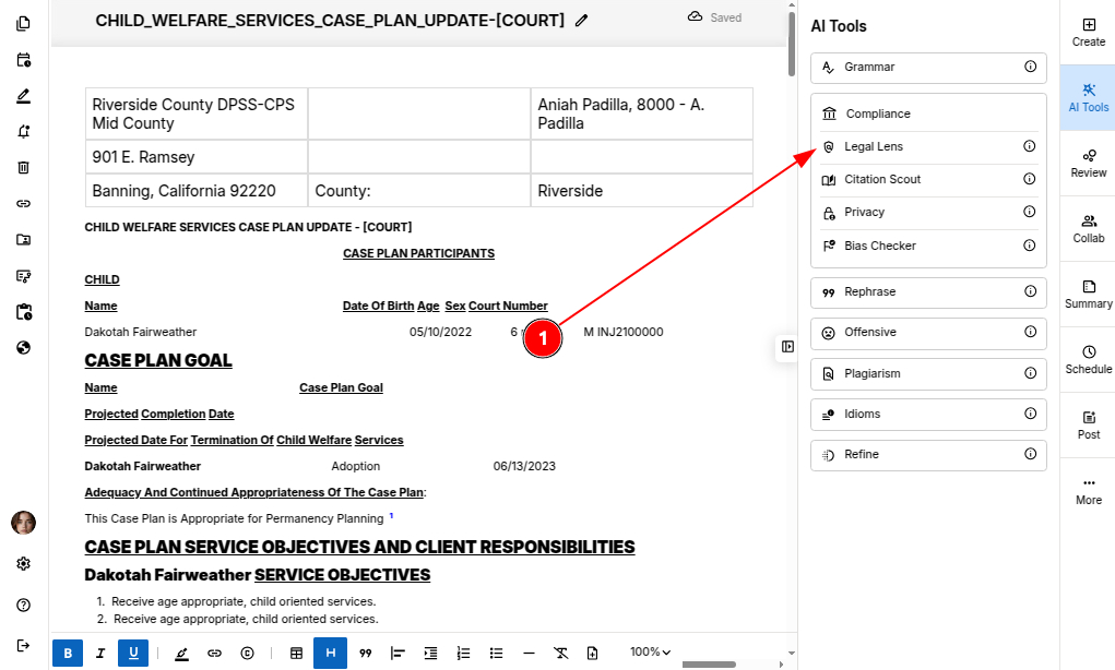 STEP 1: In the Prooflex editor, select “Legal Lens" under Compliance AI tools.