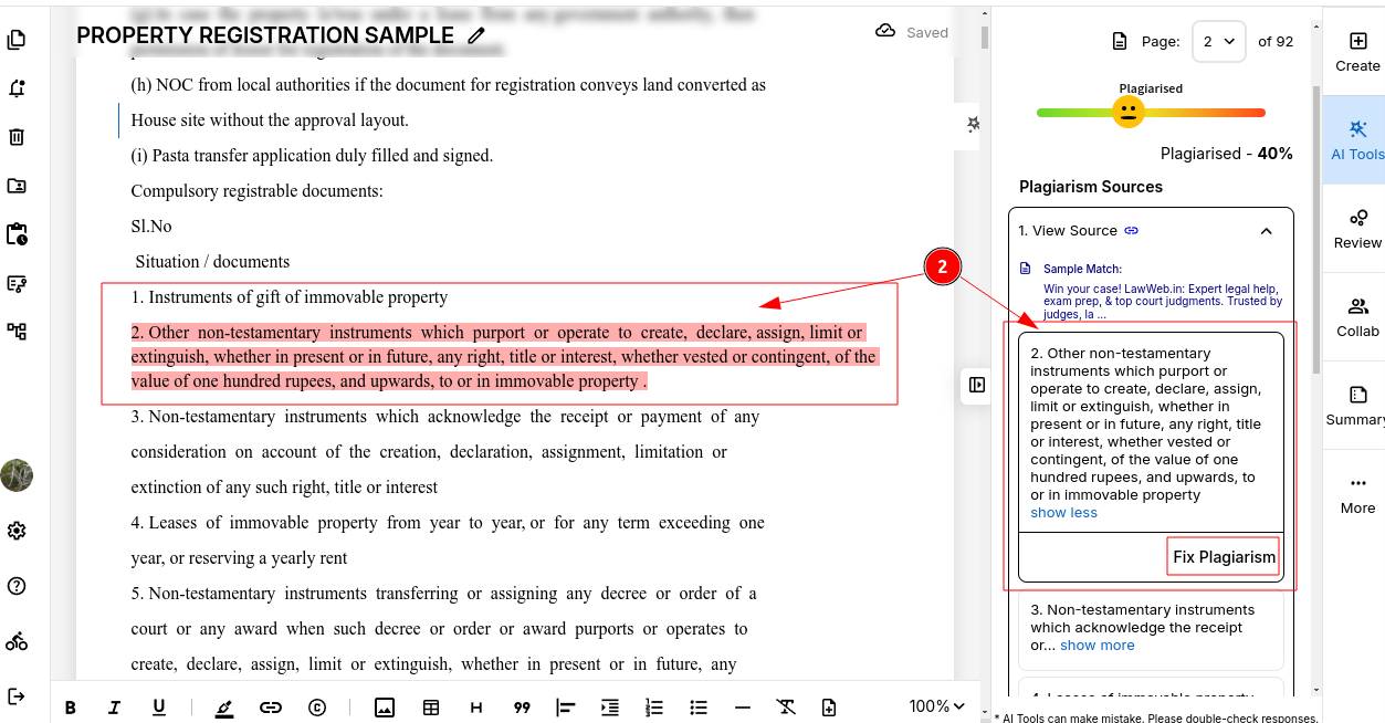 STEP 2: Click on any highlighted sentence to review it. Then click "Fix Plagiarism" to begin rephrasing the flagged text and make it uniquely yours.