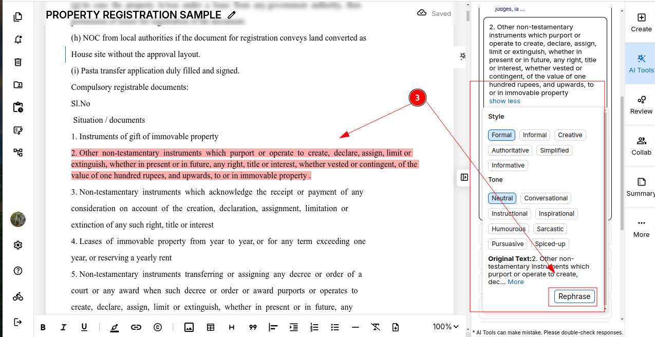 STEP 3: Before rephrasing, select your preferred tone and writing style. Once you are happy with your settings, click "Rephrase."