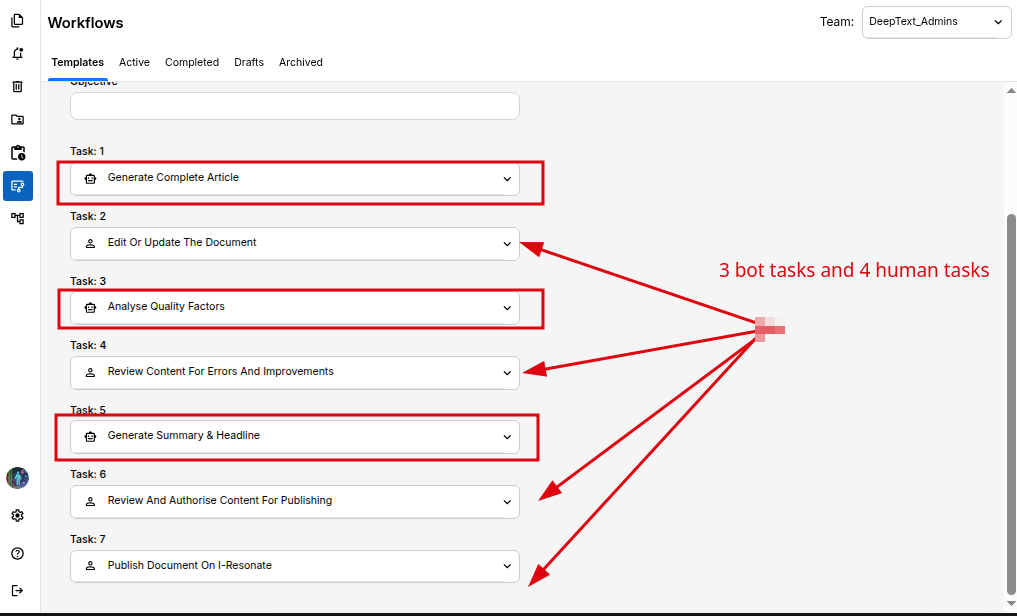 This Workflow has 4 Human tasks, and 3 Bot Tasks, as seen below.
