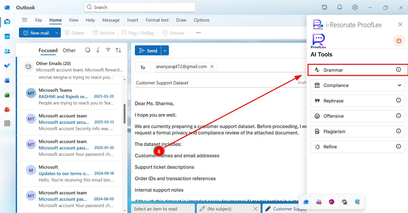Select the tool you need from the panel. For this example, select Grammar to check your email for language and writing improvements.