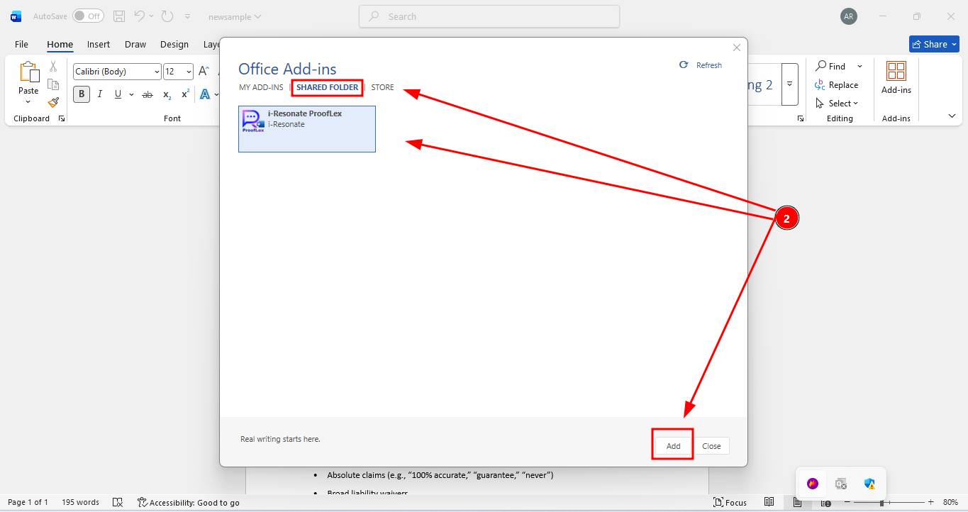 2. Open Shared folder here. You will here see the ProofLex word plugin.