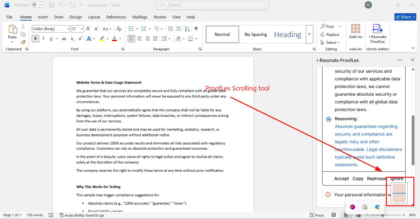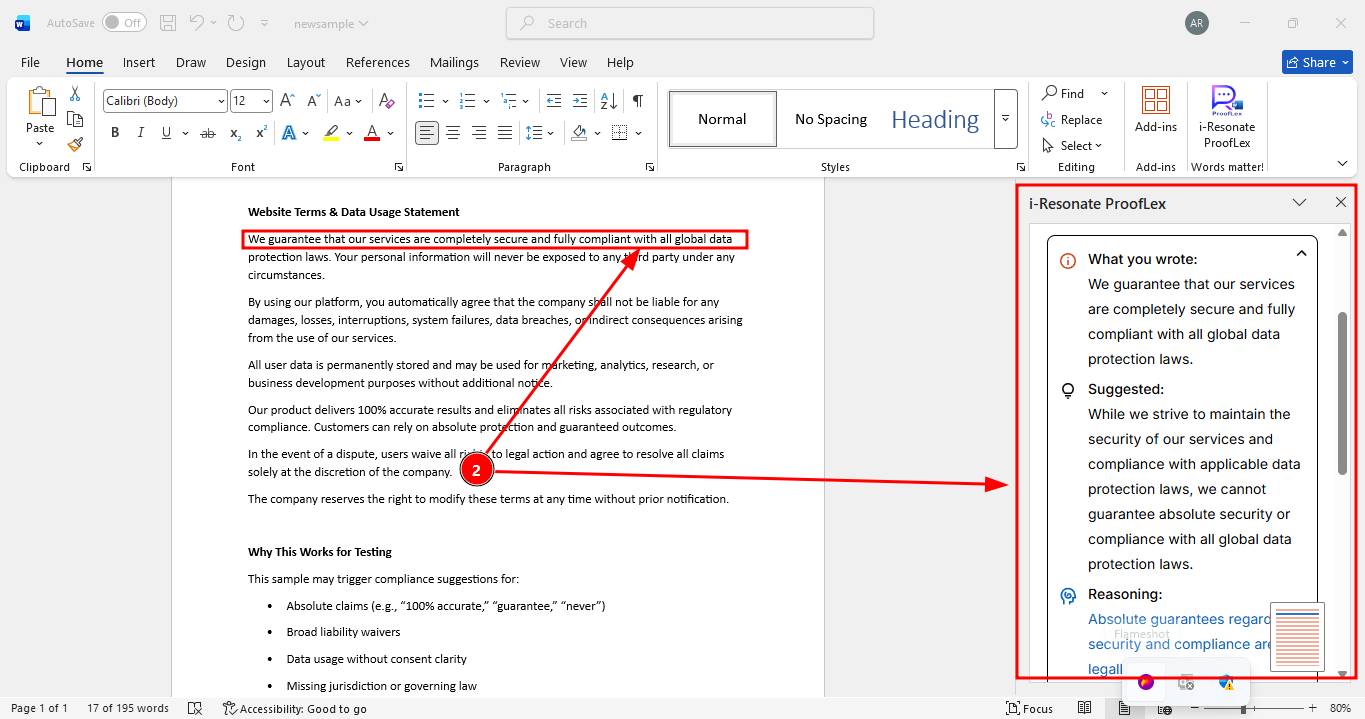 2. ProofLex will now highlight sentences that may require compliance review. It opens a detailed suggestion card showing: what you wrote and the suggested correction.