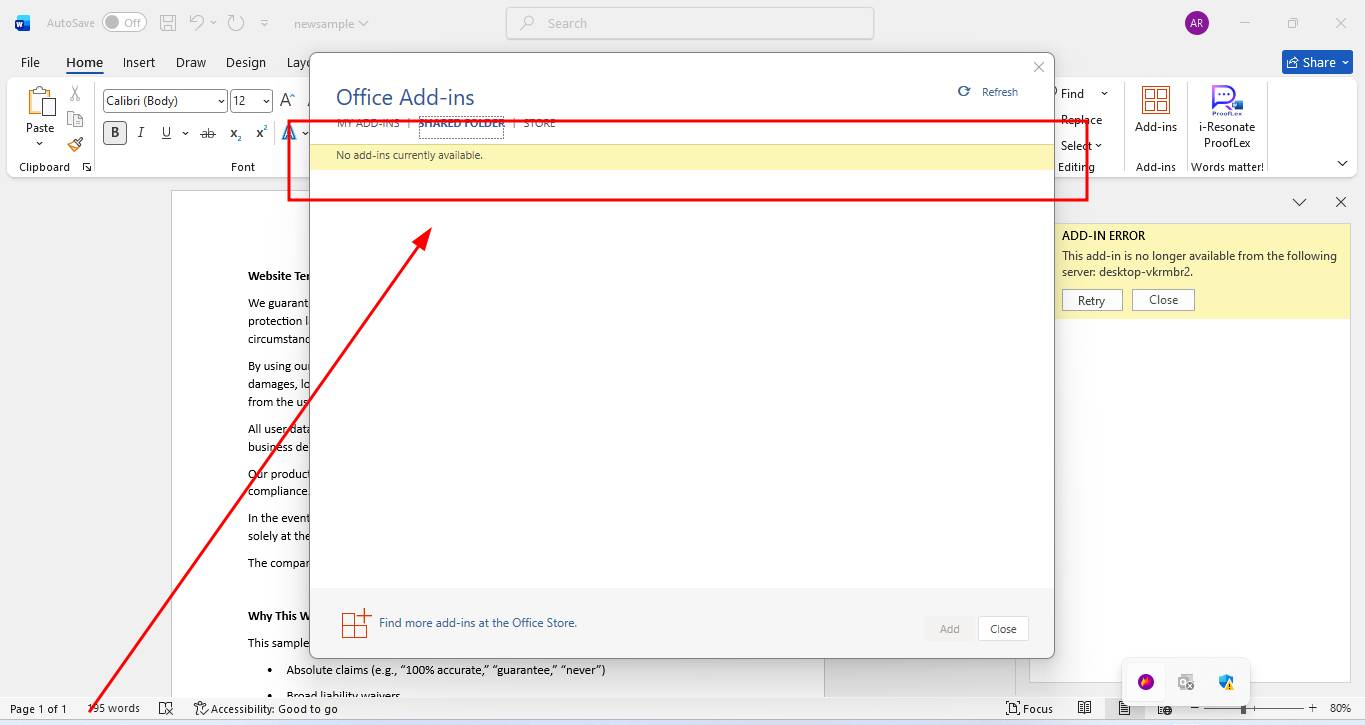 1.Open Microsoft Word or Microsoft Outlook (Desktop) and navigate to ProofLex add-in inside "My Add-ins."