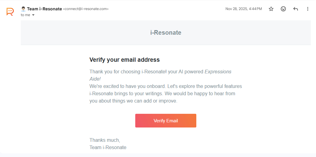 4. If nothing works , drop an email from your registered email id to connect@i-resonate.com with a subject : "EMAIL VERIFICATION ISSUE" and we will look into it urgently.