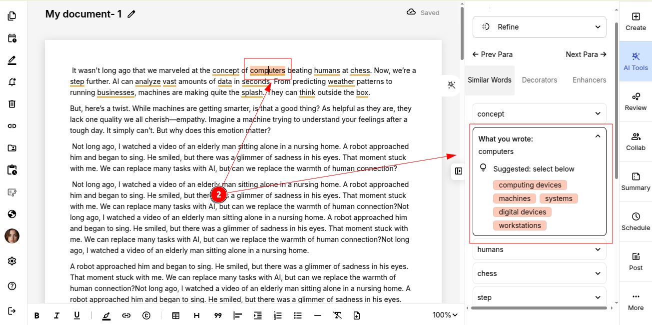 Step 2: ProofLex highlights words in the selected paragraph that can be refined.