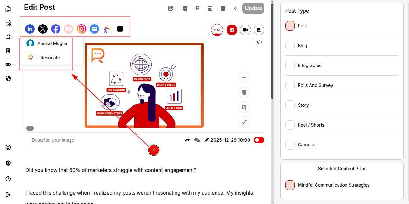 STEP 1: Once your post is created, choose all the social profiles where you want the post to be published.
